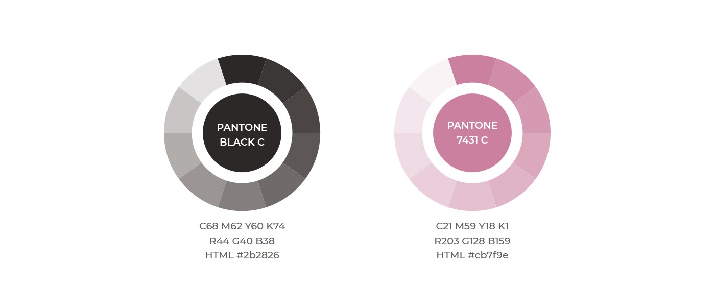 La paleta cromática se construyó a partir de tonos suaves —rosas empolvados, malvas y grises cálidos— que evocan bienestar, feminidad y serenidad, permitiendo que la marca respire elegancia sin caer en estridencias.